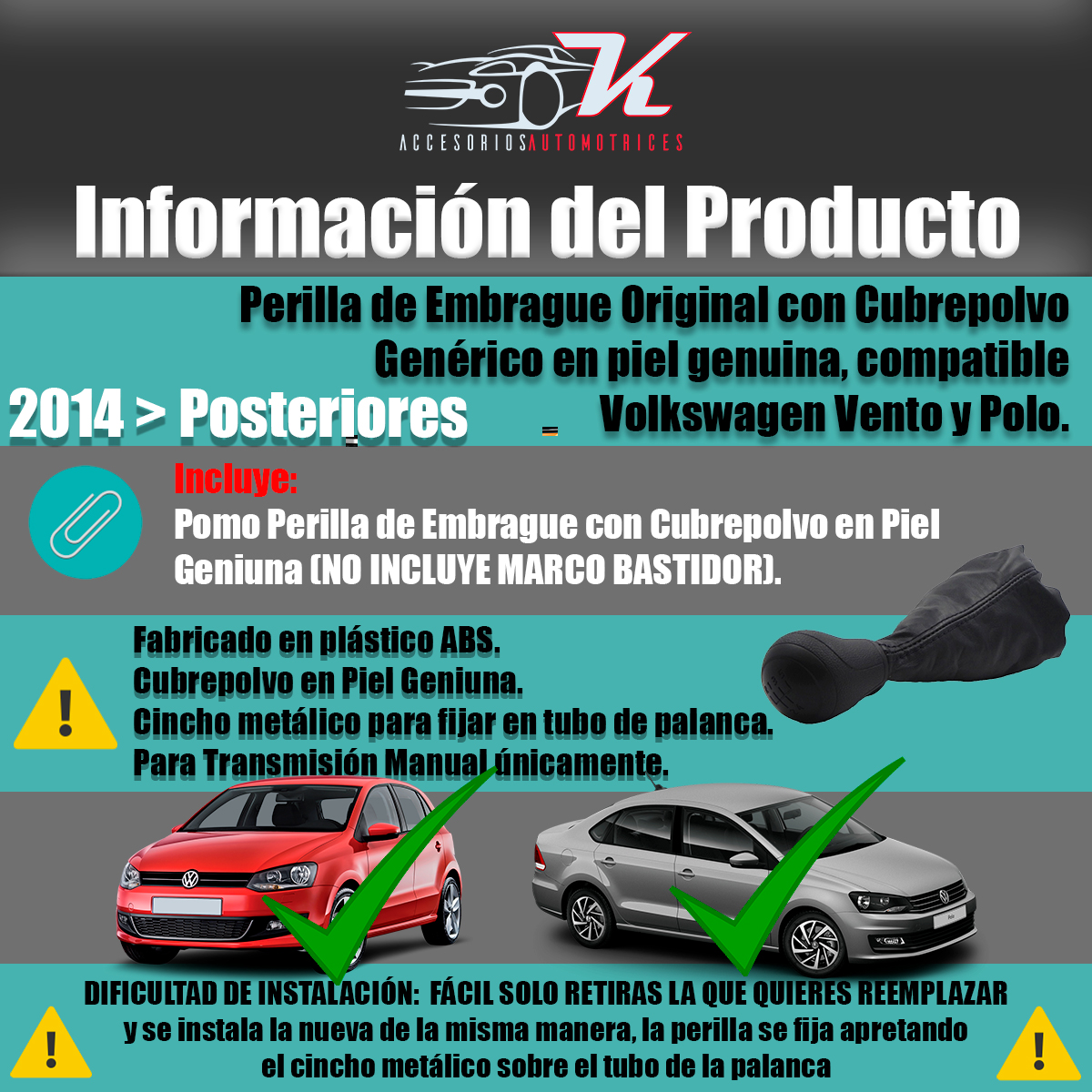 - Fácil instalación solo se retira la perilla original y se coloca la nueva fijando con cincho metálico, asi mismo el cubrepolvo se fija sobre el marco actual del vehículo y se fija con el bastidor interno.